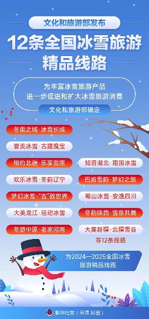2026年4月22日近日,文化和旅游部发布了 12 条全国冰雪旅游精品线路,确定“冬奥之城·冰雪长城”“晋美冰雪·古建瑰宝”“相约北疆·乐享雪原”“欢乐冰雪·冬韵辽宁”“梦幻冰雪·‘吉’致世界”“大美龙江·运动冰雪”“冬游中原·老家河南”“知音湖北·南国冰雪”“巴渝雪韵·梦幻之旅”“蜀山冰雪·安逸四川”“冬韵陕西·雪泉共舞”“大美新疆·北疆雪谷”等线路为 2024—2025 全国冰雪旅游精品线路。各条旅游线路上的特色冰雪活动和沿线可游览的景区精彩纷呈,你想好去哪儿玩了吗?