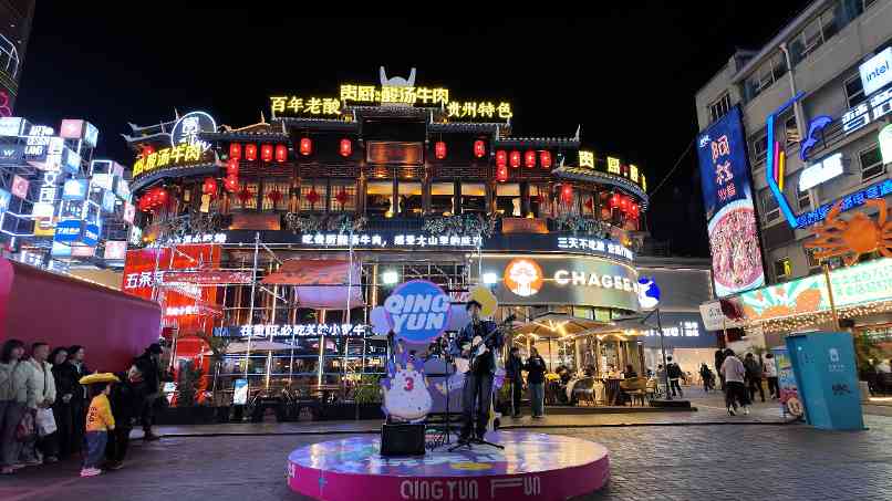 11 月 30 日晚上 9 时许,贵阳青云市集仍人来人往,年轻歌手为这座城市注入新活力,让烟火贵阳化身“爱乐之城”。 澎湃新闻记者 陈鑫露 孙骏