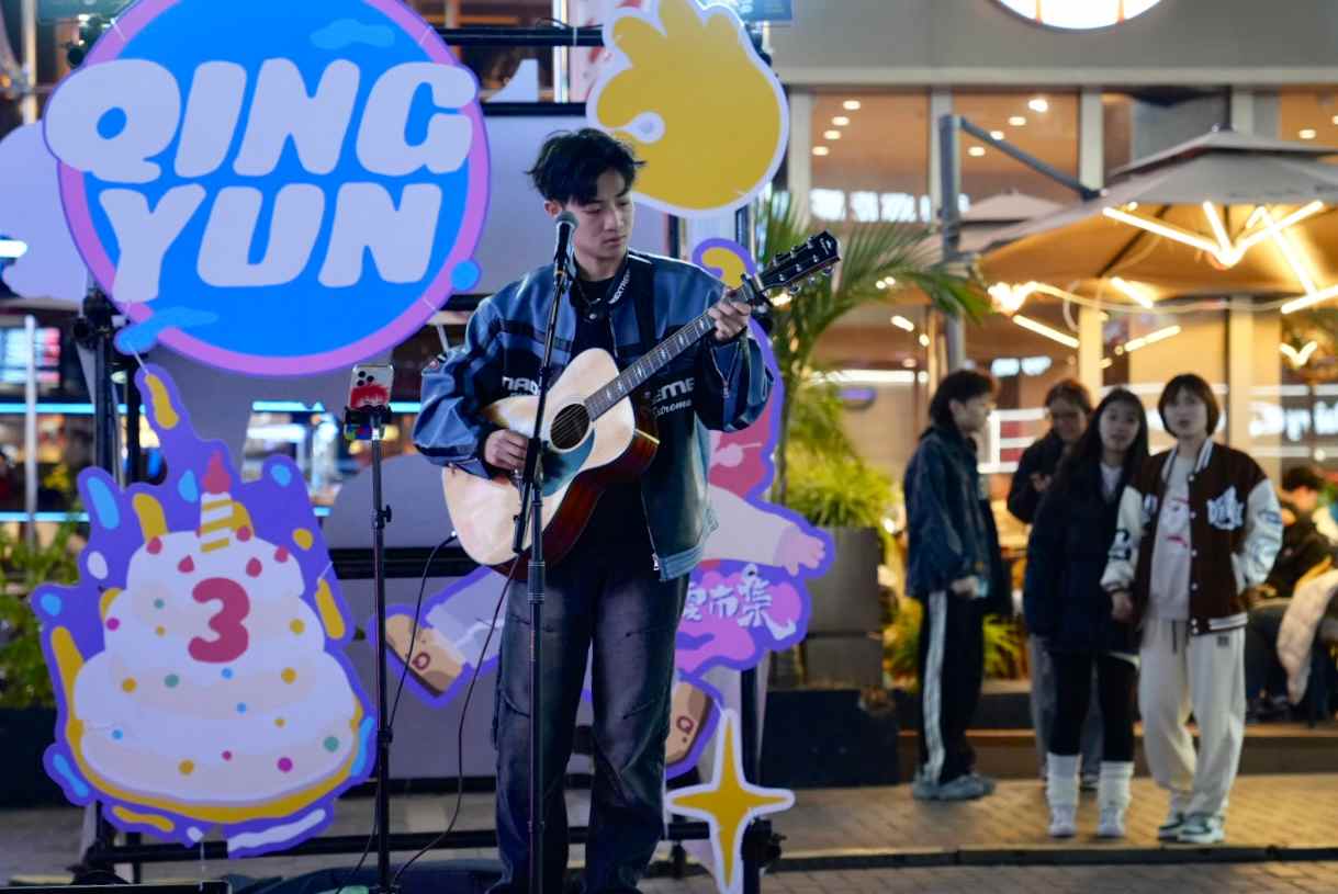“后来我总算学会了如何去爱,可惜你早已远去消失在人海……”11 月 30 日临近晚上 9 点,初冬的泠风中,贵阳市区青云市集的人流仍熙熙攘攘,在中央广场的一隅,歌手杨颢语站在小型舞台上,专注演唱着《后来》这首歌曲。当旋律抵达高潮部分,台下的观众也不由自主地加入合唱,随着音乐轻轻摇摆,共同沉浸在冬日的浪漫氛围之中。