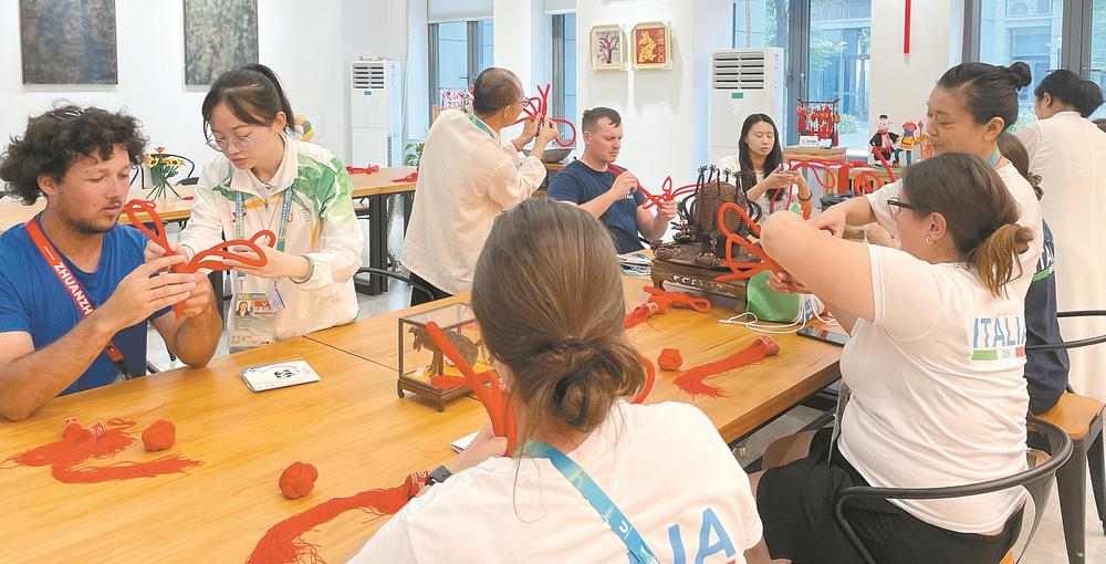 绳编、剪纸、蜀绣、皮影戏、书法……7 月 30 日,记者走进成都大运会大运村互动体验中心看到,数十种既富有中国韵味又饱含四川特色的文化体验项目,让世界各地的嘉宾在这里“沉浸式”体验中华优秀传统文化。