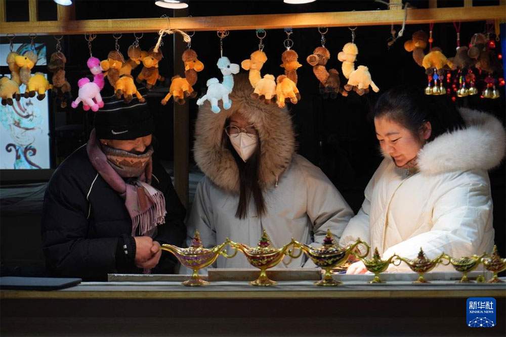1 月 21 日,在甘肃省敦煌市的敦煌夜市,游客选购纪念品。
