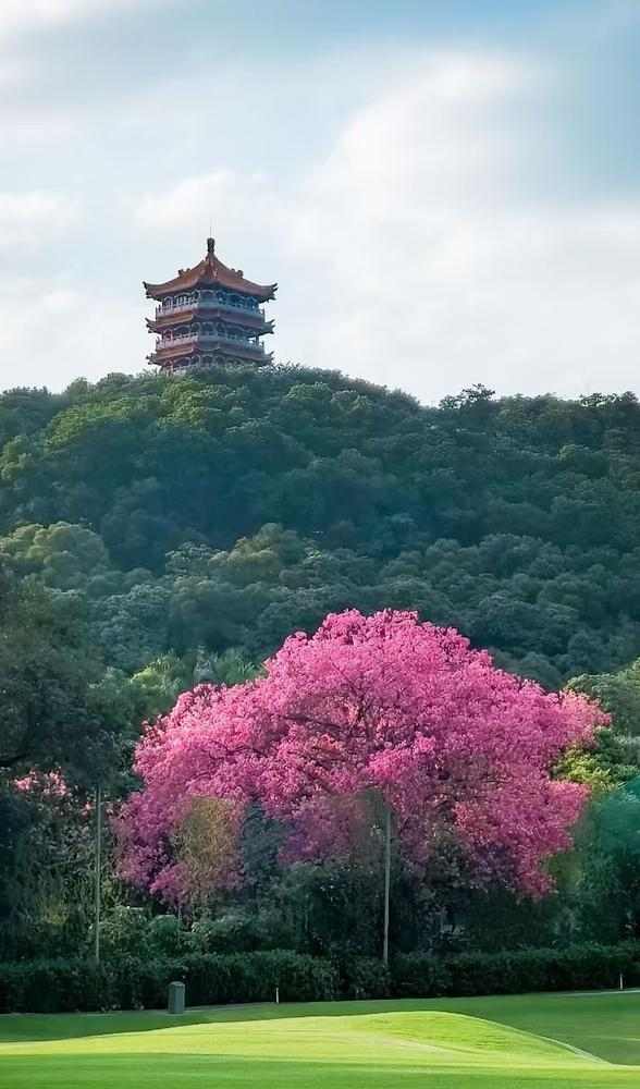 2026年4月28日十月的广州市白云山上,一树树娇艳的粉红异木棉藏在满山的绿意中,与蓝天、绿树交织成画,粉得动人、蓝得净透、绿得惬意,尽显白云山生态之美、静谧之美。