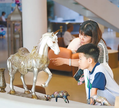 陕西省西安浐灞国际港丝路会客厅的文创商品中心内,游客在选购文创产品。