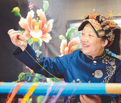 四川省邛崃市,国家级非物质文化遗产传承人杨华珍正在展示藏羌织绣。当地大力发展特色产业,促进文旅融合。