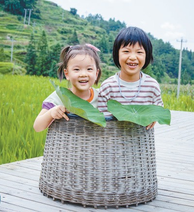 贵州省雷山县利用当地特色文化资源发展乡村旅游,带动当地村民增收。图为小游客在白岩村玩耍。