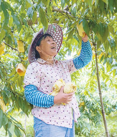 江苏无锡杨氏农业专业合作社内,工人在采摘水蜜桃。近年来,当地依托水蜜桃等特色产业打造生态休闲旅游度假区,推进农文旅深度融合。