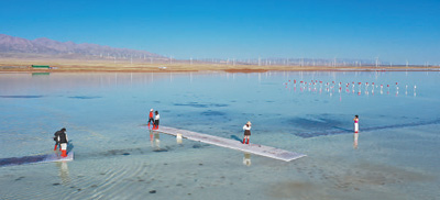 游客在青海省海西蒙古族藏族自治州乌兰县茶卡盐湖天空壹号景区游玩。