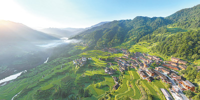 贵州省黔东南苗族侗族自治州充分利用当地的自然资源发展旅游。图为晨光中的丹江镇村落风光。