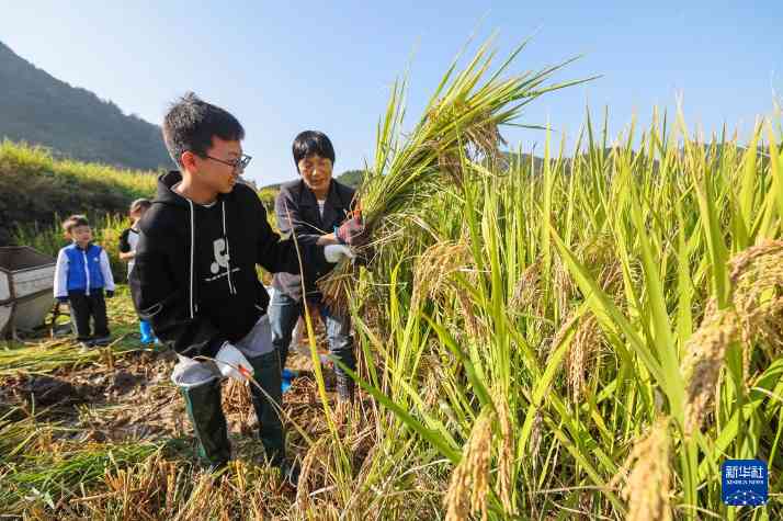 11 月 2 日,在锦北街道龙马村的稻田里,小游客们在体验割稻及传统打稻。