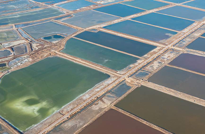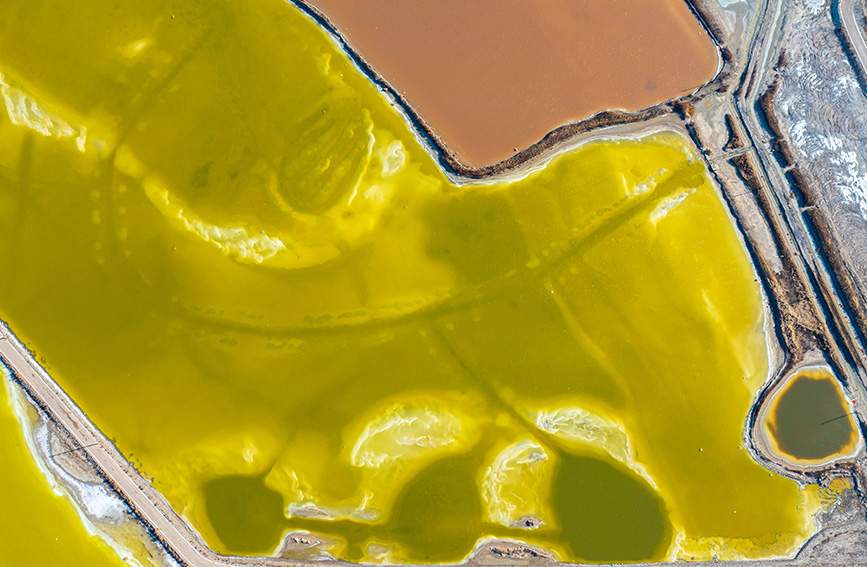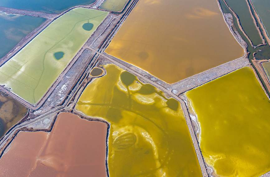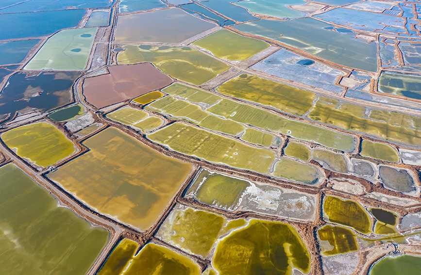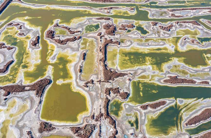 冬日时节,随着气温降低,山西运城盐湖湖面上,色彩斑斓、景色如画。芒硝结晶,“硝花”似雪,盐湖里各种线条和几何图案,犹如大自然的调色盘,十分迷人。