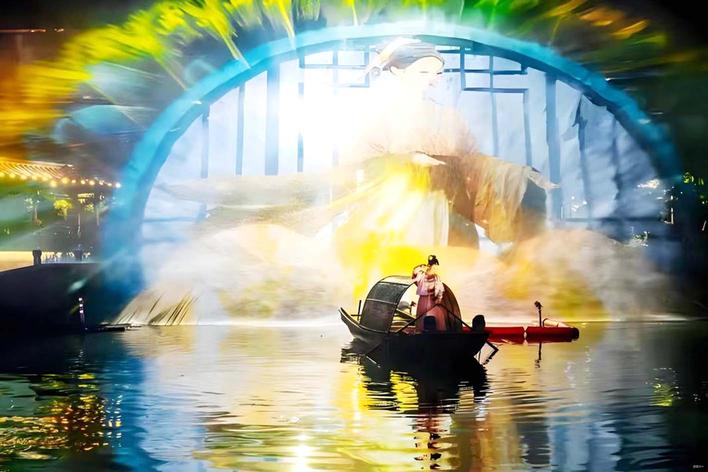 以流淌千年的古运河为天然舞台,扬州用创新应用场景打造出一座“流动的历史博物馆”,借科技架起古今对话的桥梁。“这是全国首个以古运河为天然舞台的全景式沉浸演艺项目,以运河为核心载体,通过‘入梦扬州’‘吴王开运’‘隋唐起运’‘康乾大运’‘绵长好运’五大篇章,生动串联起扬州千年发展脉络。”瘦西湖文化旅游股份有限公司相关负责人介绍,演出综合运用全息投影、智能灯光、裸眼 3D 等前沿技术,融合演员实景演绎与飞行器特效,将历史场景、人物故事与运河实景深度融合。