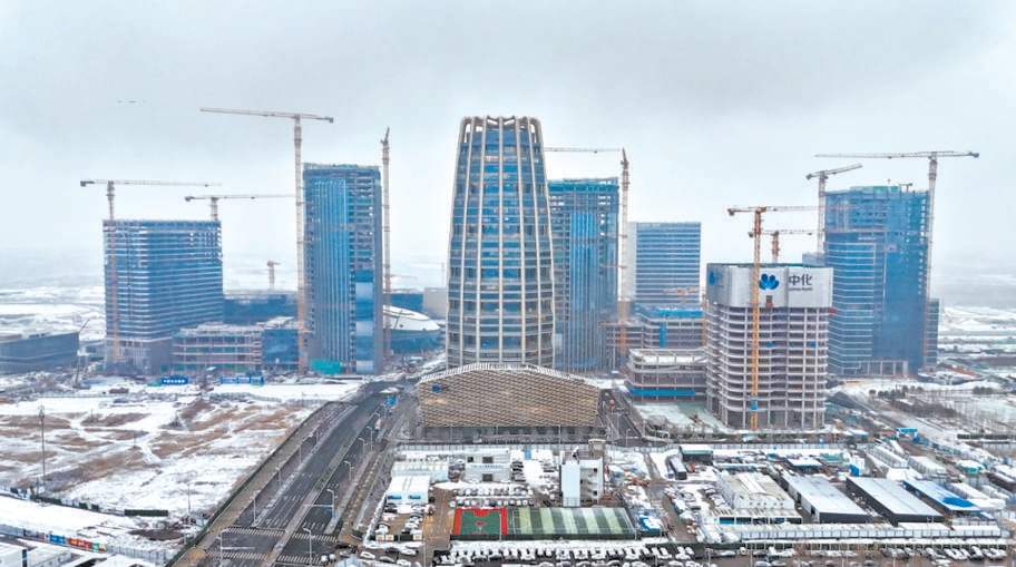12 月 12 日,雪中的雄安新区启动区塔吊林立,正在加快建设。